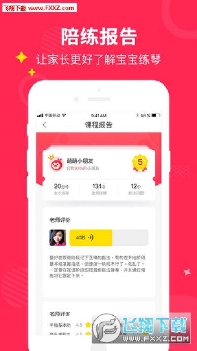 4、陪练周期性成长报告:教研老师定期会根据孩子练琴数据的整合与分析,整理出阶段性的“成长报告”,详细记录孩子学琴的成长变化,帮助家长更了解孩子,让孩子练琴更有针对性。