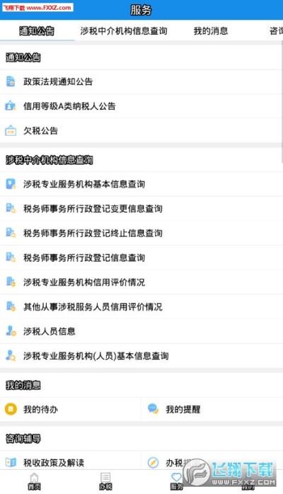 (三)服务:四川税务app提供查询,权益保护,预约办税,通知公告,咨询辅导,公共查询五大项服务。