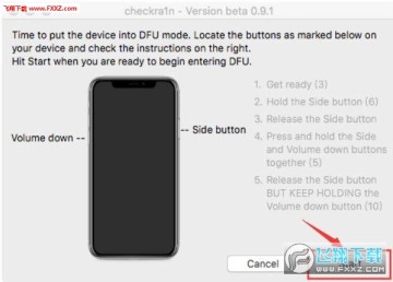 4.点【Start】根据提示将设备进入DFU模式,就可以自动执行越狱