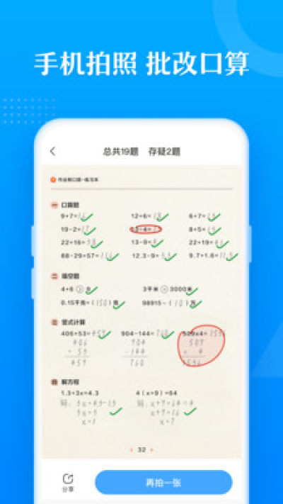 2.多题型批改:已支持口算题、竖式计算、混合运算、解方程式、脱式等题型的批改,一次拍照,整页批改。