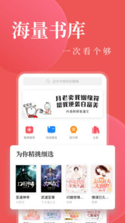 涵盖各类热门畅销小说大全,包括玄幻奇幻小说、言情小说、武侠小说、都市小说、穿越小说、有声小说、、耽美小说、同人小说、全民小说、爱情小说、科幻小说、恐怖小说、经典图书等等,你可以尽情追书、看书、读书、听小说,还可以记读书笔记。