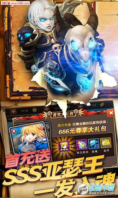 3、超值福利来了!首充任意金额送666元尊享大礼包,三星【亚瑟王】豪华助阵,加送10000钻石、高级材料、体力药水。