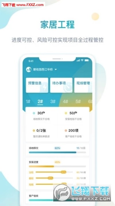 筑美云工程app为工程项目现场管理人员提供一套移动化、标准化、规范化、精细化的现场管理工具,帮助现场管理人员管理施工现场场地、安装人员、商品情况等,支持对工地现场形象、场地检查、场地验收、施工交底、安装进度反馈等数据进行记录和管理,现场数据进度可视化、户型楼栋可视化。同时支持监管巡检部门对工地现场进行检查,主要为安装情况、安装质量、进度情况、人员管理情况等进行上报。