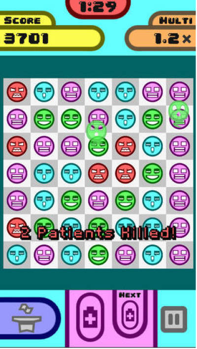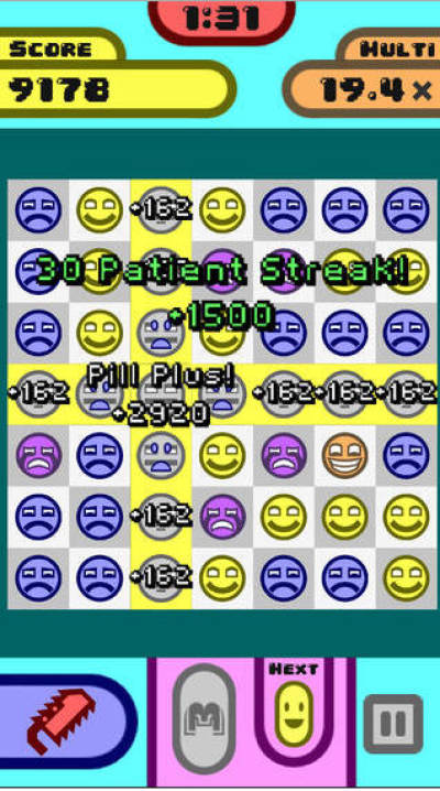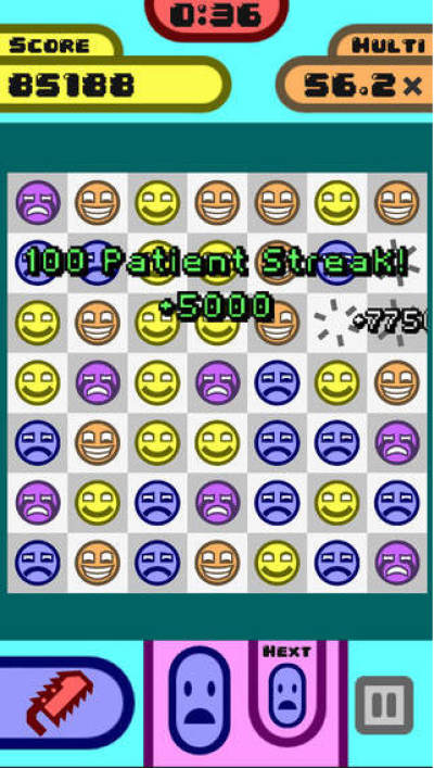 游戏的玩法并不难,选择一个病人的情绪进行点击,然后这位病人的情绪将会对它上下左右四个病人的情绪产生影响,是相互抵消还是加重症状就得看玩家的点击顺序了。游戏的目的还是让病人的情绪恢复平静正常,如果病人的头像成了极端情绪(极难过跟极开心)并且闪动,那得赶紧让他稳定下来,否则病人就被你治死了…