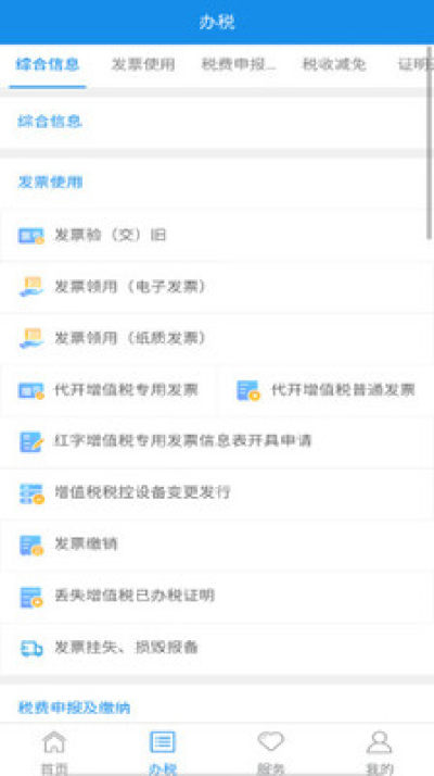 [办税服务] 支持增值税小规模纳税人申报 支持移动缴税 支持电子发票代开,纸质发票代开申请,发票领用 支持预约办税 可查看实时办税地图 支持自然人办税