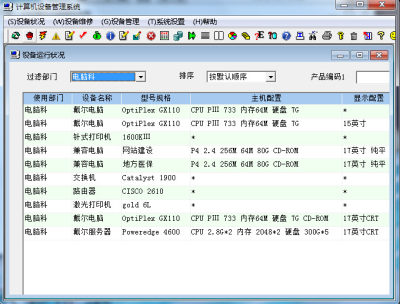 本系统全程记录了电脑设备的购入情况、维修情况、报废情况,方便跟踪电脑的使用情况和质量情况。本系统不同于一般的设备管理系统,是专门为电脑管理设计的,主机配置和显示配置分别记入不同的字段,方便电脑维修和调配,是单位计算机管理不可缺少的工具。