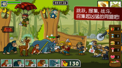 玩家通过点击左右半屏来让猴子在几颗大树之间移动并拾取香蕉,而这些香蕉就是出兵所需要消耗的资源。和一些对推塔防游戏不同,这里并没有人口限制一说,只要香蕉足够,待各个动物的 CD 冷却之后,想出多少都行,当然这也是因为公益作品的缘故,难度的设定上不会过份为难大家。