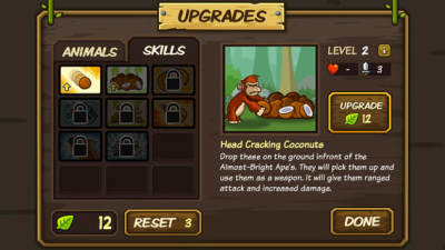 《森林防御战:猴子传奇》是一款带有公益性质的休闲小游,主要还是为了向大家传达一种环境保护意识,当然你也可以把它看成是“猴出没”,和我大天朝的《熊出没》一样,在这里玩家需要发动森林里的伙伴们一同对抗前来伐木的工人。