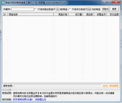 淘金币抵扣商品搜索工具是一款绿色小巧专门搜索淘金币抵扣商品的工具,有了它,你就再也不怕淘金币白白浪费了。功能比较单一,使用也比较简单由于淘宝为避免资源浪费,搜索结果只给出前100页,也就是一个关键词最多能搜索到5200个商品