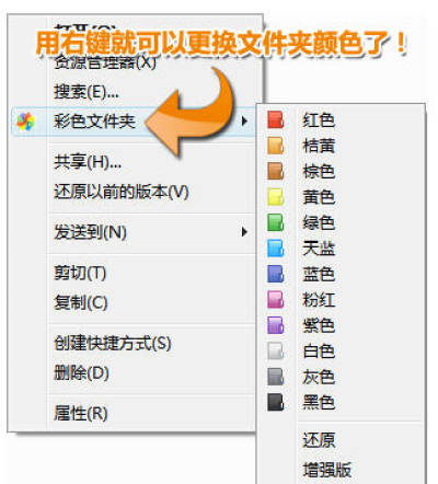 本软件可以快速让你将文件夹变成红色、绿色、紫色、粉红等各种颜色,你只需要在想要改变颜色的文件夹上面点击右键,然后选择你想要的颜色就可以了!就这么简单,你就拥有一个个性化十足的文件夹了。
