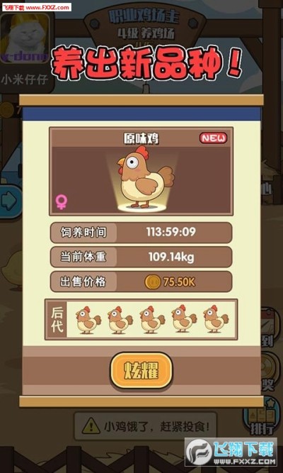 这是一款十分轻松的养成类游戏。鸡生蛋蛋不一定生鸡!不同种类的鸡相爱会有意想不到的效果哦。不需要太多的技巧,不需要繁琐的日常,只需点点手指打理一下,就能得到非常爽的体验,一定要记住,星级越高的鸡长相越魔性!!!