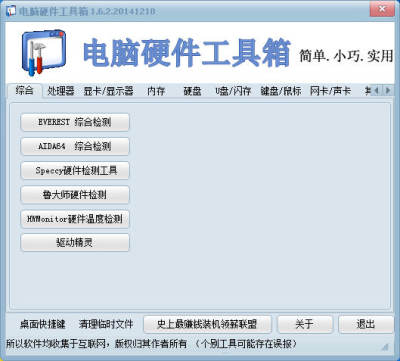 电脑硬件工具箱整是一款常用硬件检测测试软件合成工具包,其中包括显示器、主板、 CPU、硬盘、内存、显卡、网卡、声卡、键盘、移动设备(U盘、MP3)等多项功能。该工具箱比常见测试软件更全面,更专业,更准确可靠,是电脑新手和DIY爱好者的必备工具,后期将继续集成更多更好的绿色硬件工具。
