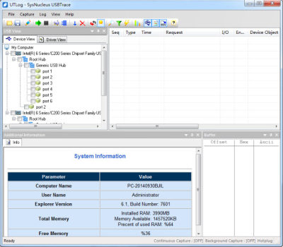 SysNucleus USBTrace主要用于监控和分析 USB 控制器,集线器和其它 USB 设备的连接情况。它可以监控包括 USB 控制器,USB 集线器和 USB 设备的连接,请求,和运行情况。也可以为 WDM 驱动程序开发者提供丰富的信息。可以设定程序在后台进行信息捕获,或者持续的捕获以便进行分析。