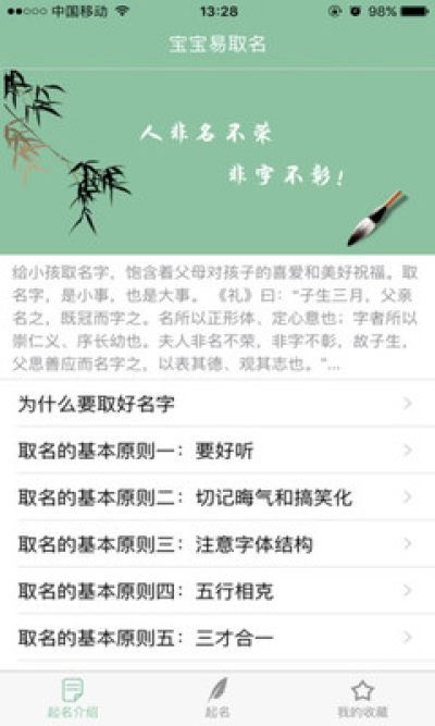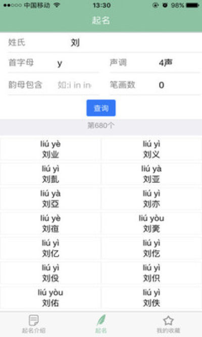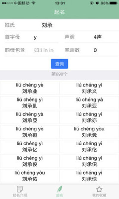 宝宝易取名,是一款取名助手软件,提供取名方法,让天下的父母为宝宝取一个受益终身的好名字。软件分为两个部分,一为诗词取名,二为取名字典大全。可根据拼音,音调,笔画取名。可查询百科了解字义,可收藏自己喜欢的名字。