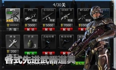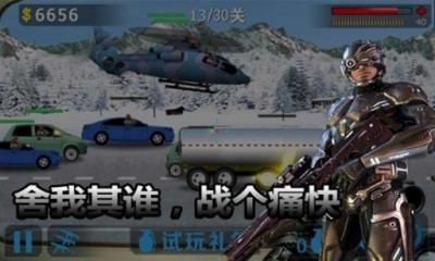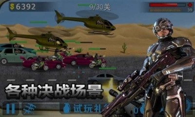 游戏共有30个关卡,每一关都有不同的NPC。随着关卡的升级,难度也在递增,并会出现武装直升机等强大的NPC敌人。为了更好的通关游戏,玩家可以在商店中购买更加强力的武器。游戏中,可以通过购买“完全修复”道具和“手雷“道具轻松过关。游戏中,不同的枪支还能升级到不同的星级,武器星级越高,武器的射击速度和弹夹量以及威力就越大,同时过关的机会就越大。