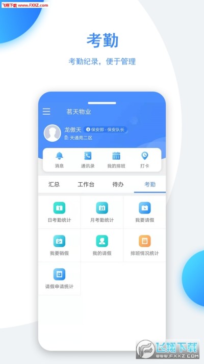 【考勤管理】支持多种模式的排班,支持APP上下班打卡,支持请假销假,并可查看汇总信息。