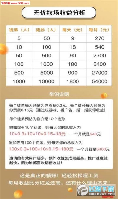 每个徒弟每天预估为你贡献0.3元,每个徒孙每天预估为你贡献0.15元(通过玩游戏,看广告,摇一摇获得收益);