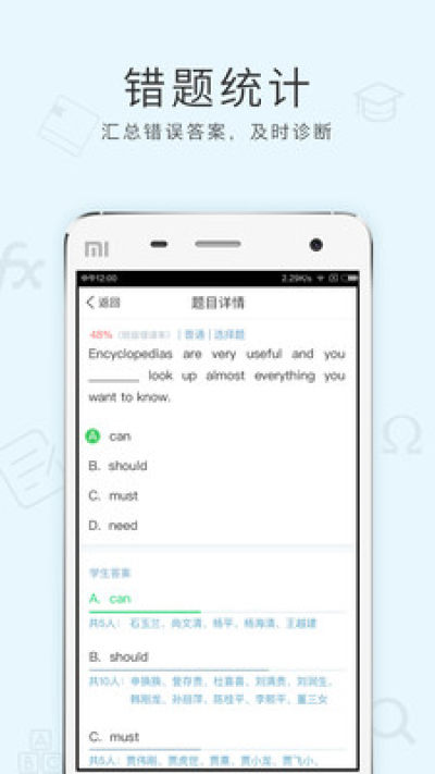 老师可以在手机或电脑上将我们准备的精选练习布置为作业,自由组合作业内容,适合不同程度的学生水平。学生完成作业后,系统自动批改,并要求学生进行错题订正。实时产生成绩分析报告,让老师可以及时掌握学生的完成情况,了解薄弱知识点,大幅减少工作量。