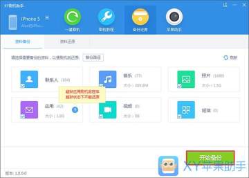 (1)连接设备成功后点击“备份还原”按钮进入资料备份页面,默认选中所有备份选项,需要注意的是如果刷机前设备已越狱,则相应的越狱应用刷机后不能还原。