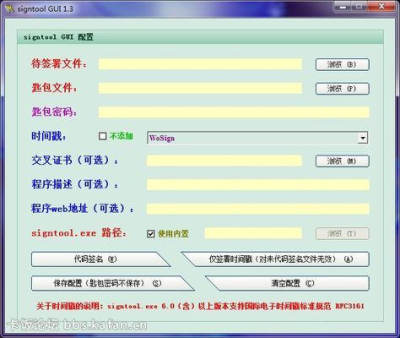 3、signtool.exe 路径:指定签名程序所在位置,可从微软下载,也可从第三方渠道获取,signtool GUI已提供了WoSign站点上的下载地址;程序也内置有6.1版本的signtool;