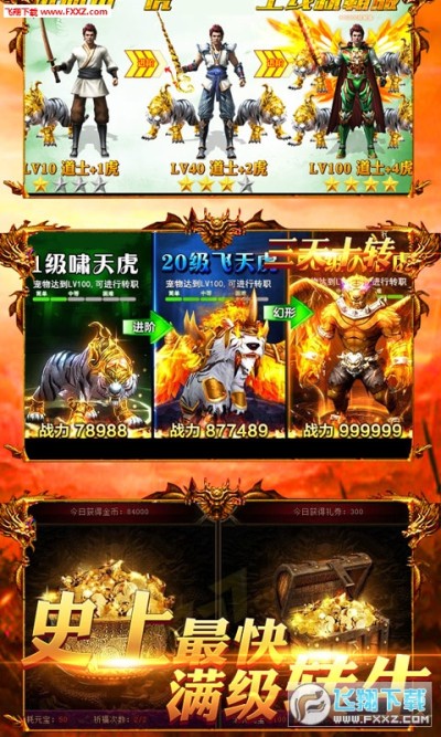 1、满V开局加送神兽:创角送满V、188888元宝、金币*1亿,再送神兽--应龙,次日登录送神兽--凤凰