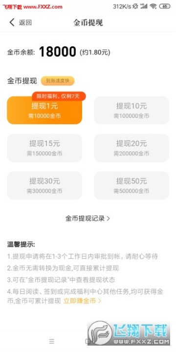满1元可申请提现到微信(提现前需看小说满15分钟),提现1-3个工作日内到账