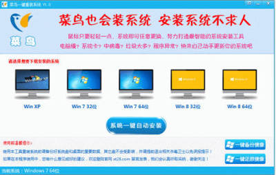 菜鸟一键系统重装工具是一款PC端非常强大的专门用于系统重装的辅助工具,彻底抛弃传统安装系统理念,无需U盘、无需光盘,即使无任何电脑基础也能快速重装系统。的是让人人都会装系统,安装系统不求人!