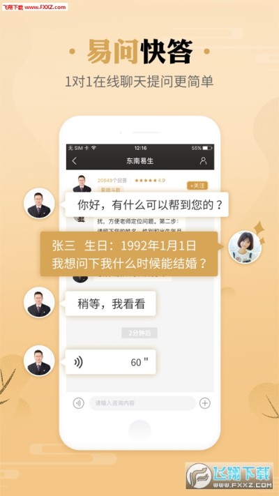 灵机大师说app是一款手机免费大师算命平台,这款软件上汇聚了麦玲玲、秦阳明、司徒法正等专业周易大师坐阵为用户提供算命的服务,在灵机大师说app上还能在线资讯大师,快来下载吧!