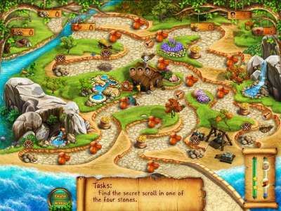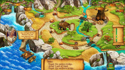在游戏的每一个关卡中,界面的下方显示本关需要完成的项目,每一个项目的完成都需要一定的食物、木材或者石料,这些资源可以在路上收集到。游戏中有休闲模式和时间模式,在休闲模式下,没有时间的限制,只要完成目标即可;而时间模式下每一个关卡都会有一定的时间限制,需要在规定的时间内完成所列出的项目。在时间模式中,时间条在界面的右侧。同时,关卡结束时会根据完成项目所用的时间进行评分,分别为1-3颗星,因此,游戏中要合理规划所做的每一件事,用最短的时间来完成,争取每关都获得三星评价。在游戏进行的时候,玩家也可以使用一些技能,技能条在时间条旁边,当图标闪烁时可以使用。鞋子图标的技能可以让人物跑得更快,手臂图标的技能可以让人物采集,修补所用的时间更好,总之是能帮助玩家更快地完成任务。