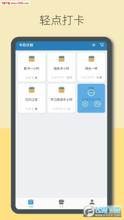 待完成计划,一目了然,轻轻一点即可确认完成计划,金币奖励立刻到账,防误触设计,可撤销不小心误点的打卡记录,奖励金币也同步收回。