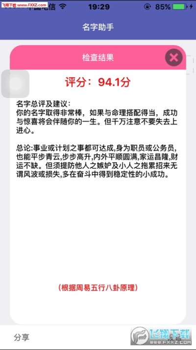 2.解名:一键查询您的姓名拼音、笔画、五行、吉凶、五格等命理释义。