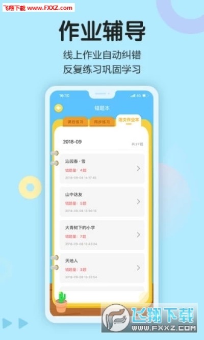 5、作业辅导:在线完成老师布置的作业,错题本自动收集学生历史错题,反复训练巩固,知识点复习;