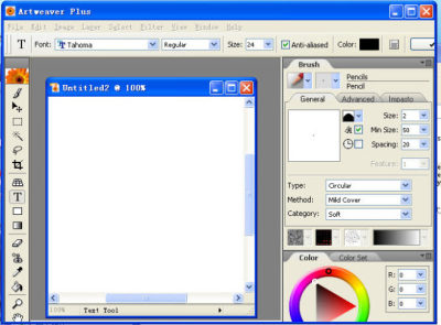 Artweaver Plus支持中文,也支持输入中文。输入中文比较特殊,点击文字工具后,需要再点击工具栏最后一个按钮,在弹出的窗口输入中文。软件支持 BMP、GIF、JPEG、PCX、TGA、IFF、PNG跟 Photoshop 的 PSD 文件;支持图层,可惜没有 PS 的图层混合属性。Artweaver Plus 还支持导入 PS 的笔刷样式和手绘板。