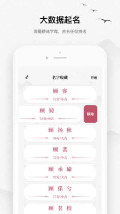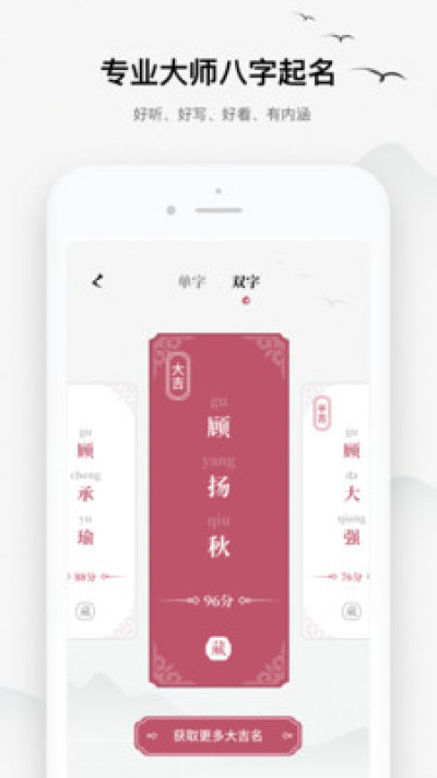任意挑选名字:推荐的名字会生成名字签牌,可切换单双字,左右滑动自选名字。推荐名字数量无限制,还可获取高分大吉名。