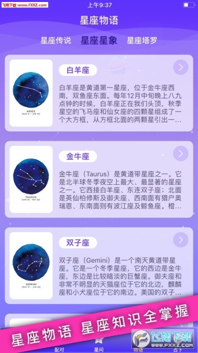 星座手册app是一款非常全面的手机星座测试占卜类的软件,在星座手册app上可以查看自己十二星座的各种信息,还有占卜的分析等等,星座手册app提供性格、配对、运势等等多种服务,快来试试吧!