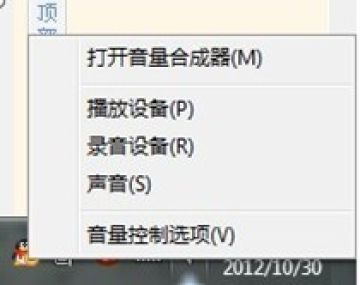 用鼠标右键单击win7右下角的小喇叭,再弹出的菜单中选择“录音设备”;