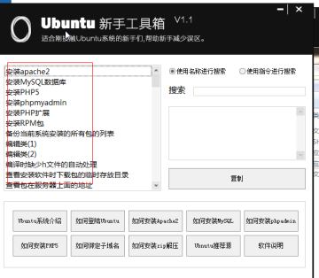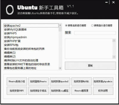 零视界ubnutu新手工具箱是一款非常实用的Ubnutu新手辅助软件,可帮助刚刚解除ubuntu的新手朋友们快速解决一些难题,例如辅助安装apache2/php/mysql等,可以快捷进行域名绑定的功能,是新手朋友们的必备选择之一。