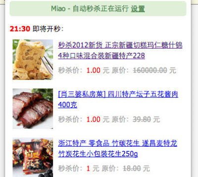 1. 点击浏览器Miao插件图标,弹出层里点击“设置默认启动秒杀”链接(默认开启)