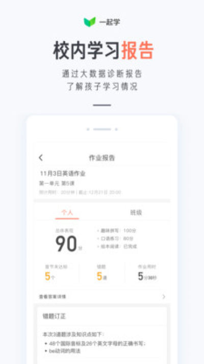 学习报告:校内作业和学习能力测评反馈,随时查看孩子学习动态和作业成绩,了解知识点掌握情况,进步退步随时掌握。