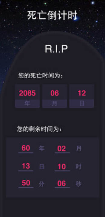 抖音很火的年龄计算器是一款在抖音上火流行的一款软件,这款软件内用户可以输入自己的信息来看到自己的死亡日期和还能活多久,很有意思,但是不要太当真哈,快来下载抖音很火的年龄计算器体验一下吧!