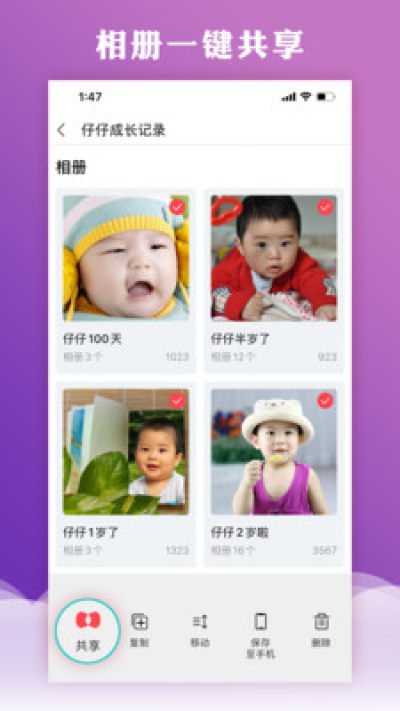 3、一键“共享”给亲友,即使成千上万张照片,一人保存,全家共享
