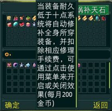 【女娲补天石】为包月道具,每月购买一次即可,不用来回跑路修理装备,适合需要长期挂机的朋友。