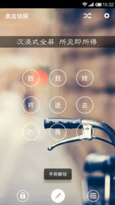 美言锁屏是一个设计非常精妙的锁屏工具,锁屏方式多样化,其内含的美言美句更是让这款锁屏软件多了几分诗情画意,让大家的锁屏变得更加的不同凡响!