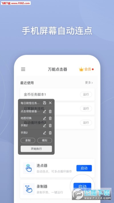 万能点击器app是一个可以模拟点击的手机神器,这款软件可以替代双手,支持屏幕单点点击和多点循环点击多种模式,同时还可以帮助用户快速的制作各种游戏脚本,自动记录操作步骤,功能十分强大,需要的朋友可以来载万能点击器app进行使用