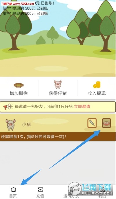 下载趣赚养猪App,填写邀请码获得猪仔,然后点养殖 ,再点喂食,就是下图箭头的方向那里,5分钟一次,喂食两次就能收获,我亲测是1.2元,首次1元提现。