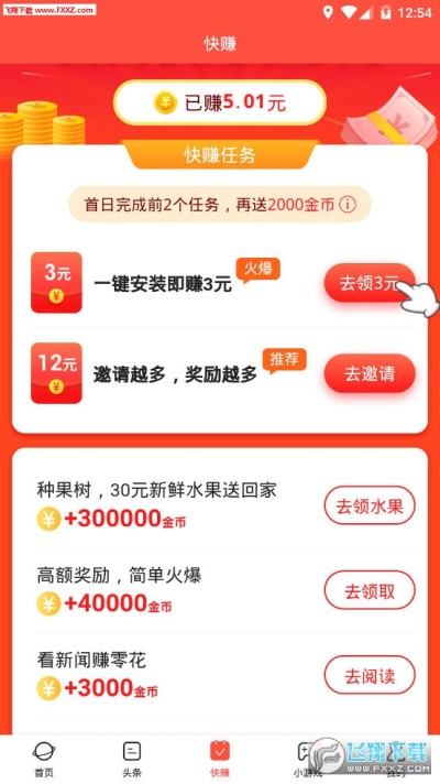 1、完成3个任务(比如下载精选软件、浏览器、看新闻),就可以得现金奖励;