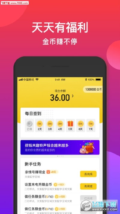 新人领铃声现金红包,设置铃声拿补贴,每天做任务领奖励,天天来天天都能赚!