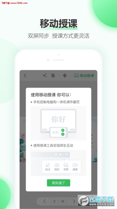支持手机投屏,灵活展示更多内容,随时展示学生成果;手机控制课件翻页,手机批注,大屏同步显示,更好地实现移动教学。