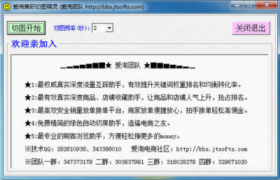 爱淘兼职切图精灵是一款功能非常强大而且实用的截图辅助工具。该软件可以按照您的需求设置切图间隔时间。操作简单,切图开始后,可以最小化窗口到右下角,不会影响亲工作,精灵运行不占内存资源,很小巧实用,最重要的一点是绿色永久免费!