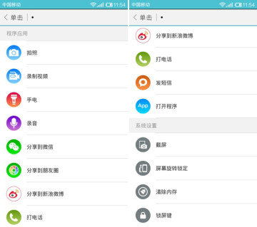 目前米键的动作指令包括“程序应用”和“系统设置”,其中系统应用是手机系统的部分功能,包括截屏、清除内存等。而程序应用则能实现某些程序的动作操作,包括拍照、手电、录音,甚至是分享到微信、微博等。而且通过“打开程序”,还支持我们自定义添加很多手机中已经安装的第三方APP。